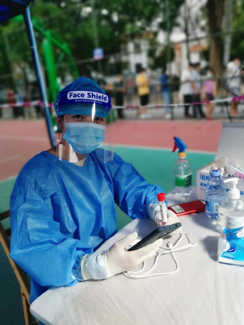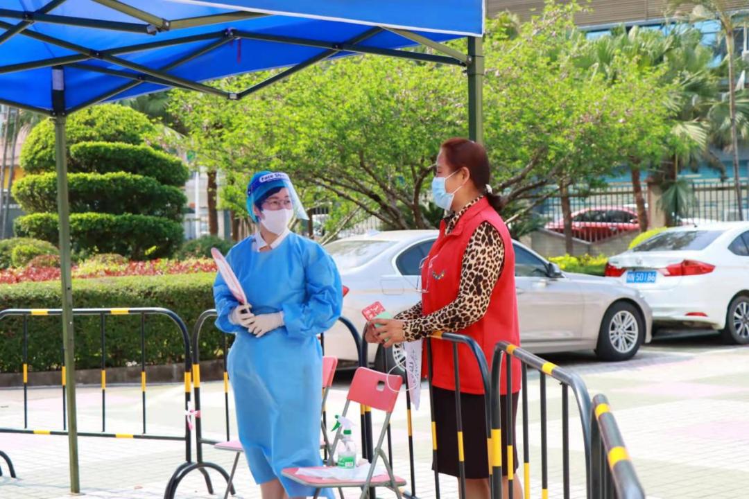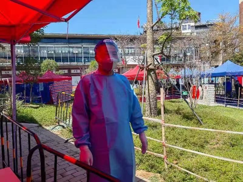 “校医承担着校园防控的主体责任,我们每天上报健康监测、统计疫苗接种、师生核酸检测等数据。这次新一轮的疫情改变了我们的生活节奏。接到紧急通知后,我加入幼儿园的采样队伍,抗疫大军中也有了我们校园大白的身影。通过几天的检测工作,深刻的体会到了医务人员和志愿者们的不容易。相信疫情很快会过去,深圳加油!”