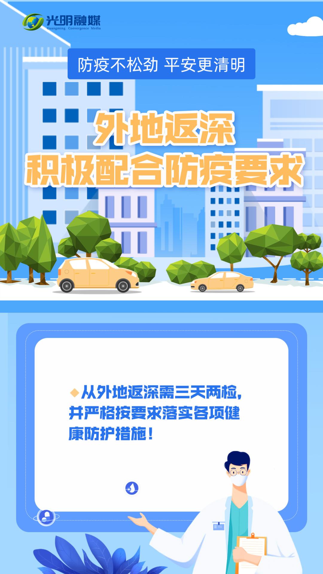 不断增强市民群众主动防疫意识,让大家及时劝阻市外重点疫情地区计划来深的亲朋好友,确需来(返)深的要第一时间主动报备,自觉做好个人防护。