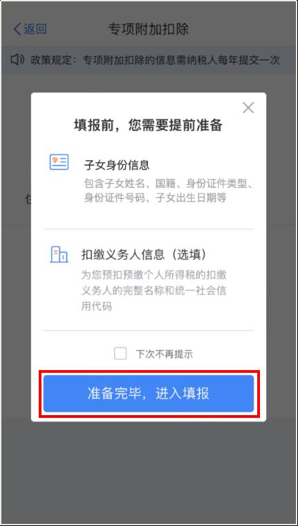 进入申报界面后,“选择扣除年度”设为2022年,点击“确认”后,系统会提示需要提前准备的资料,纳税人仔细阅读后,点击“准备完毕,进入填报”。