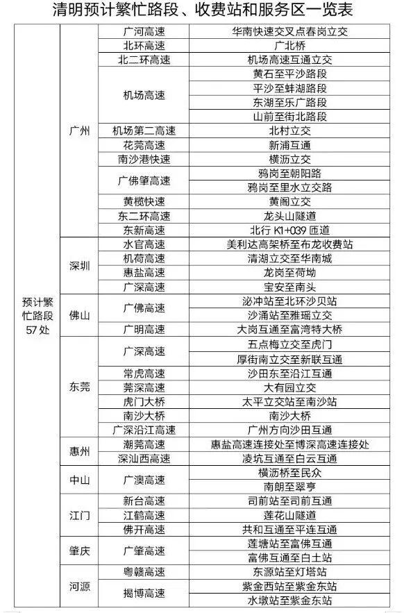 预计主要拥堵路段主要集中在广河高速、广州北环高速、广州北二环高速、广州机场高速、花莞高速、广佛肇高速等57处;