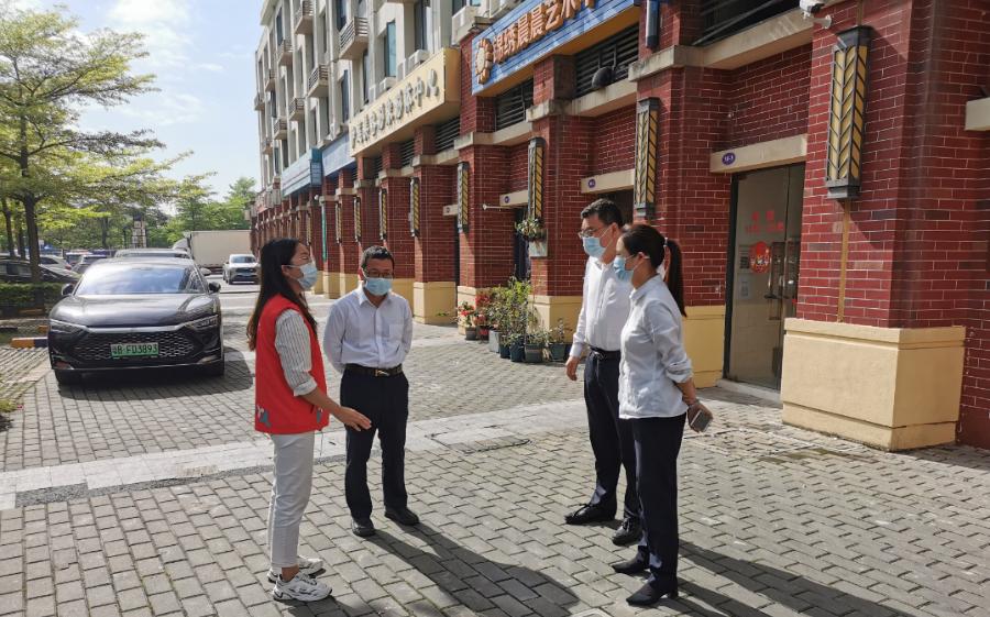 社区党委委员刘菲与招商锦绣观园物业工作人员协商如何布置场地