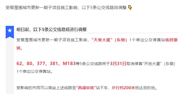 受蔡屋围城市更新一期子项目施工影响,3月31日起,罗湖“天地大厦”(东侧)1个单边公交停靠站临时撤销。62、80、377、381、M183等5条公交线路取消停靠“天地大厦”(东侧)1个单边公交停靠站。更多»