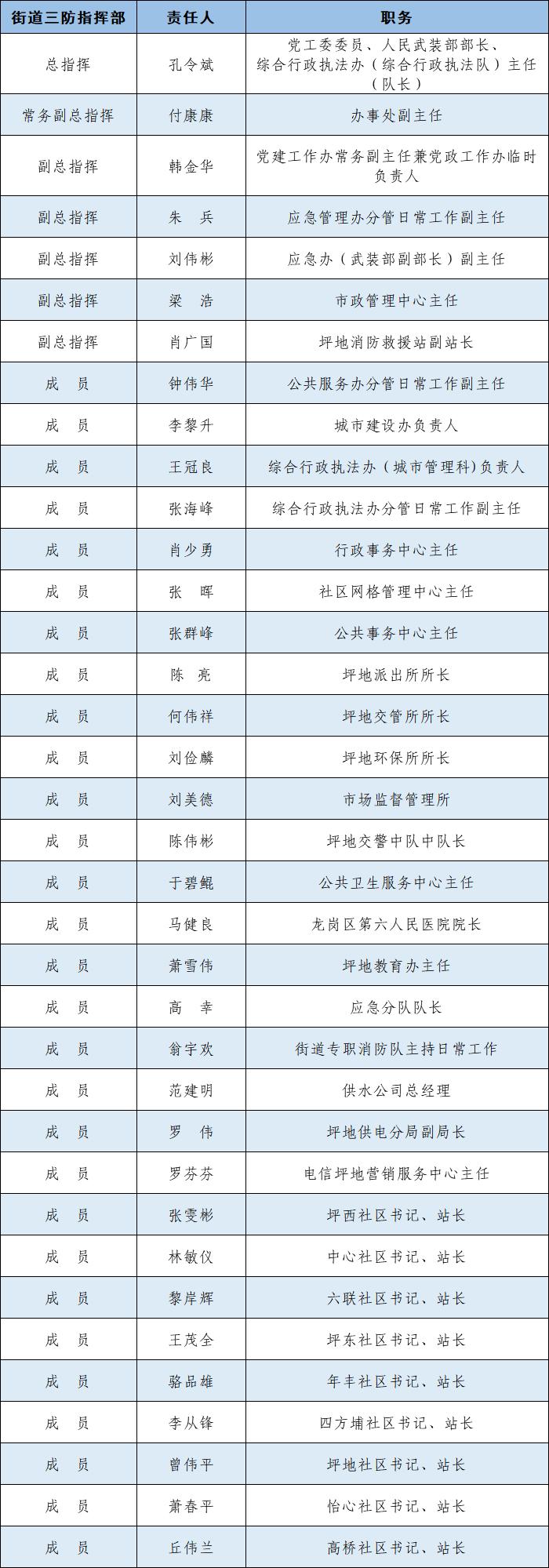 根据《广东省防汛防旱防风条例》、《深圳市防汛防旱防风指挥部办公室关于核定三防责任人有关事项的通知》及《深圳市防汛防旱防风指挥部办公室关于核定指挥部成员的通知》等文件要求,为落实三防责任,做好2022年三防工作,现将坪地街道防汛防旱防风相关责任人进行公布如下: