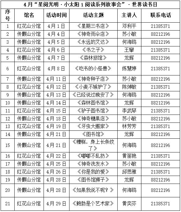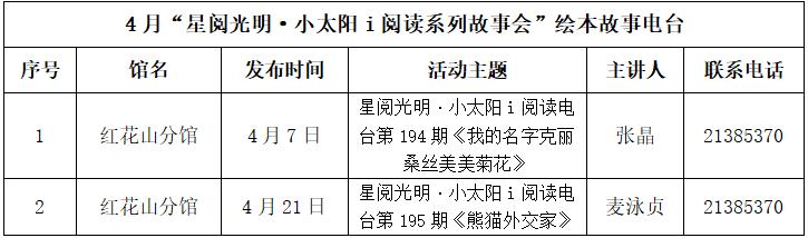 为进一步丰富“星阅光明·小太阳i阅读系列故事会”活动形式,2020年2月开通线上“小太阳i阅读绘本故事电台”,以光明区图书馆馆员为主,并面向读者招募主播,向公众提供形式多样的文化活动。3月份开展“星阅光明·小太阳i阅读系列故事会”·绘本故事电台活动详见下表。