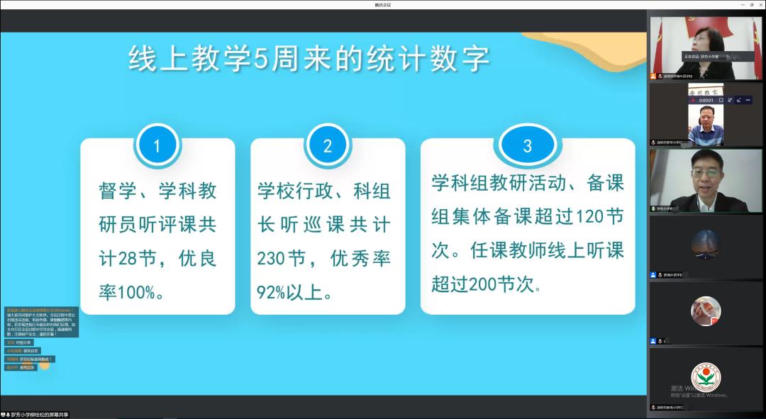 潘明琴介绍了罗湖区线上教学的相关情况,全区中小学在线教学百花齐放、精彩纷呈,并且呈现迅速进化内涵发展趋势,从关注技术资源,到优化课堂教学,再到着重关注学生差异化需求,逐步实现了从规范、有序走向智慧、高效和人文关爱。各教育集团充分发挥优势,开展“云”教研活动,依托集团优质教学资源和名师资源,以研讨课、说课、多维度评课、论坛等形式开展教研活动,辐射广、影响大、效果好,起到了很好的示范引领作用,不断提高教师在线教学能力。