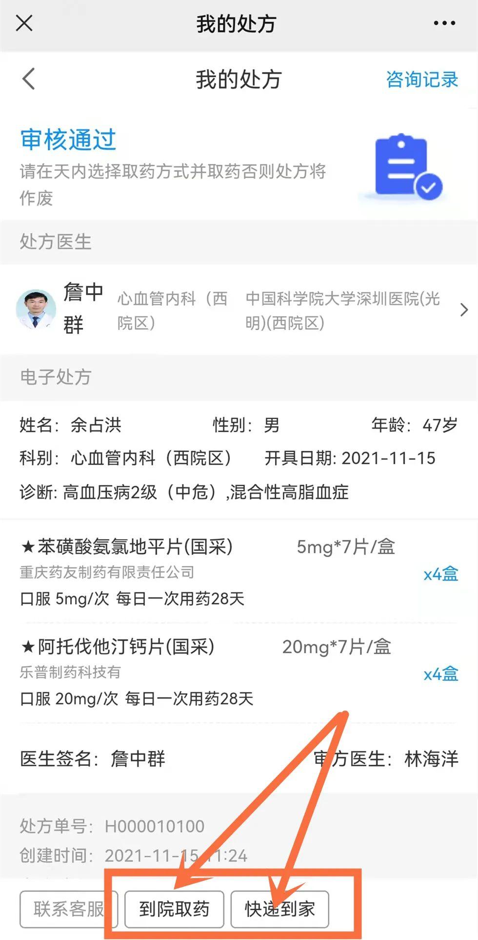 点开处方后在下方选择取药方式:到院自取 或 快递到家,选择快递到家需要自己本人收货并到付快递费,请务必正确填写收货地址和电话。
