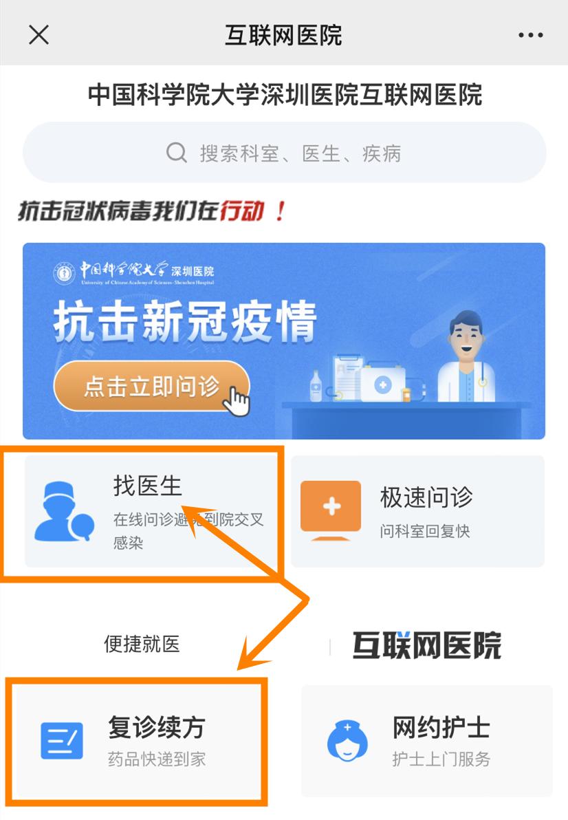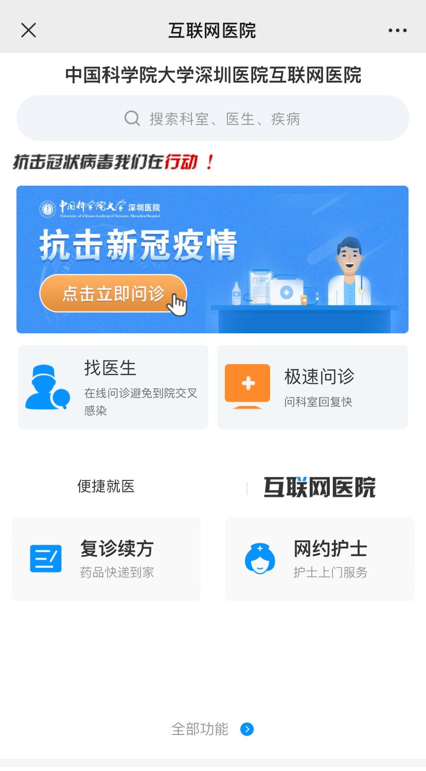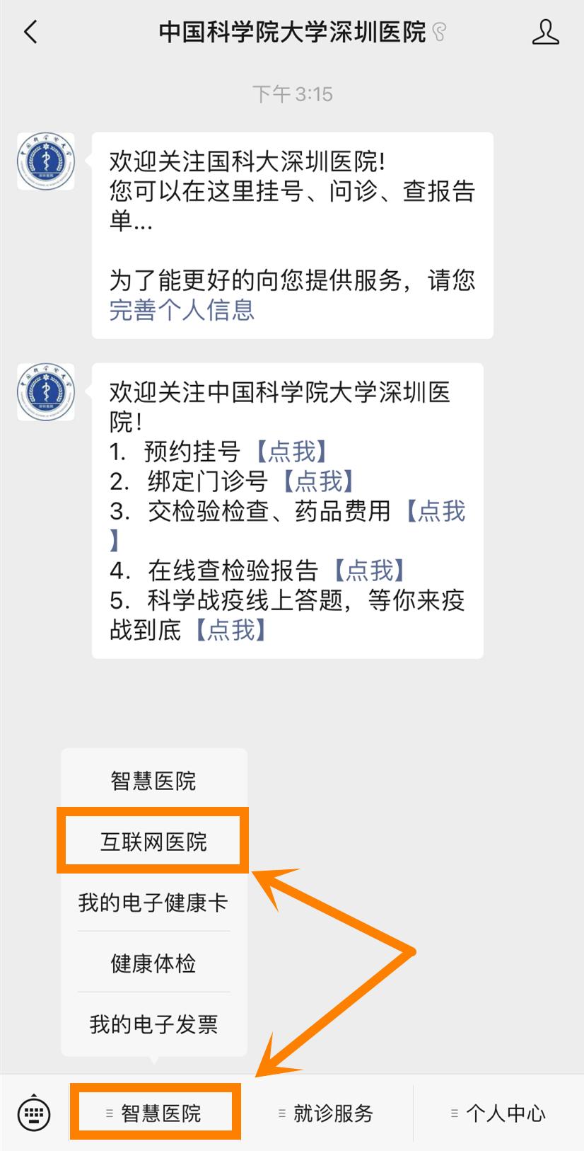 微信关注“中国科学院大学深圳医院”公众号,点击左下角“智慧医院”,选择“互联网医院”即可进入互联网医院界面。