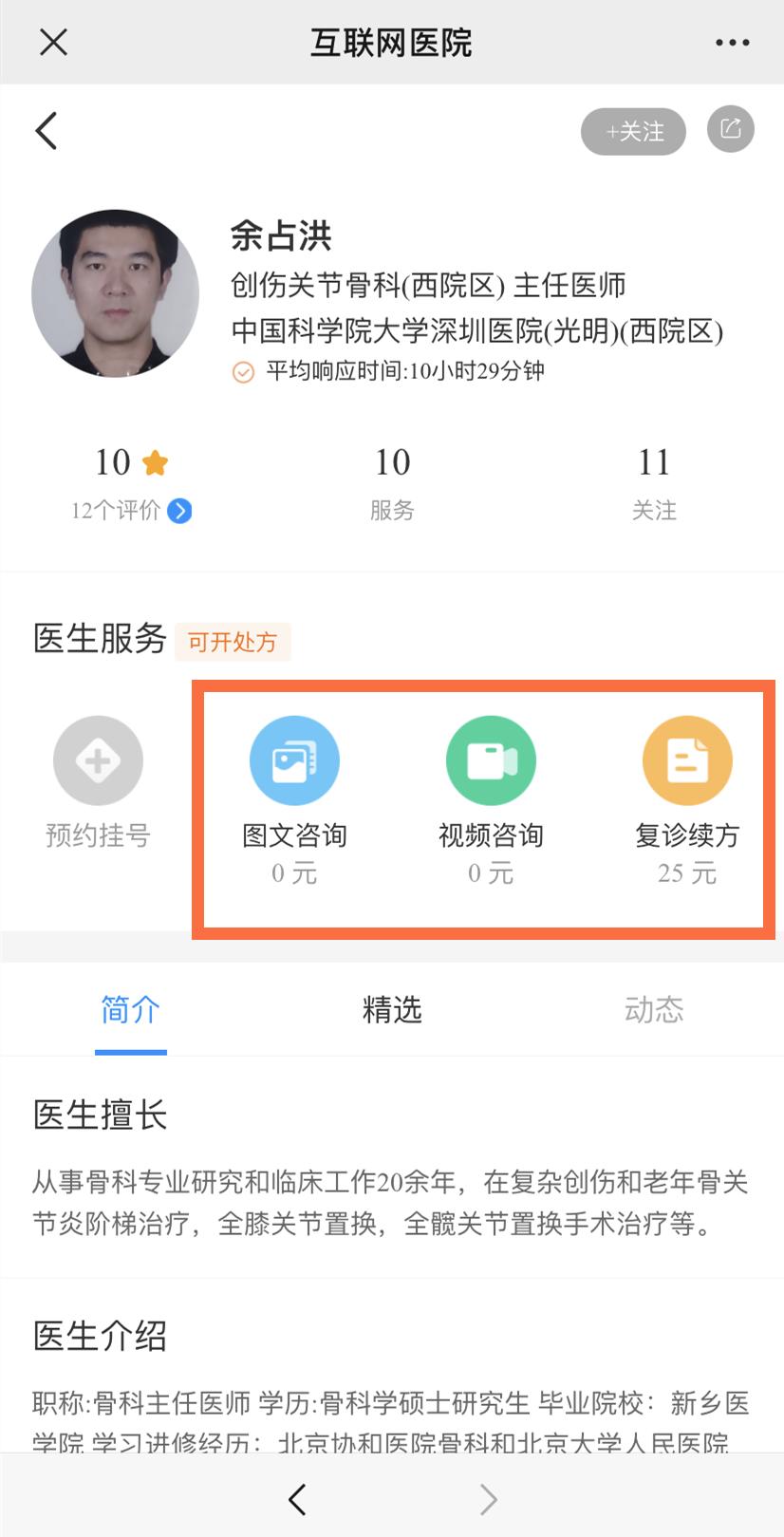 选择医生后,可继续选择“图文资讯”、“视频咨询”、“复诊续方”服务。