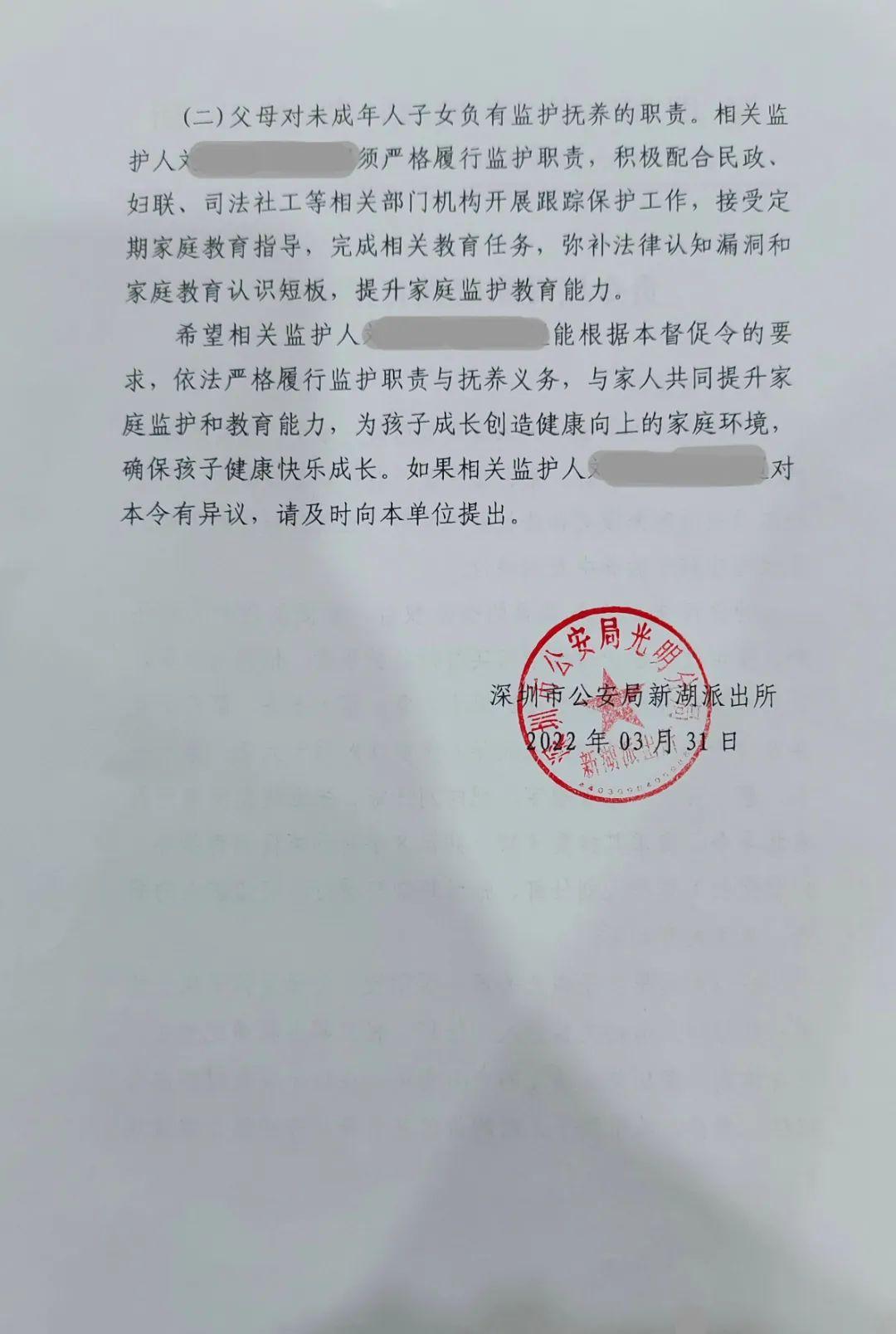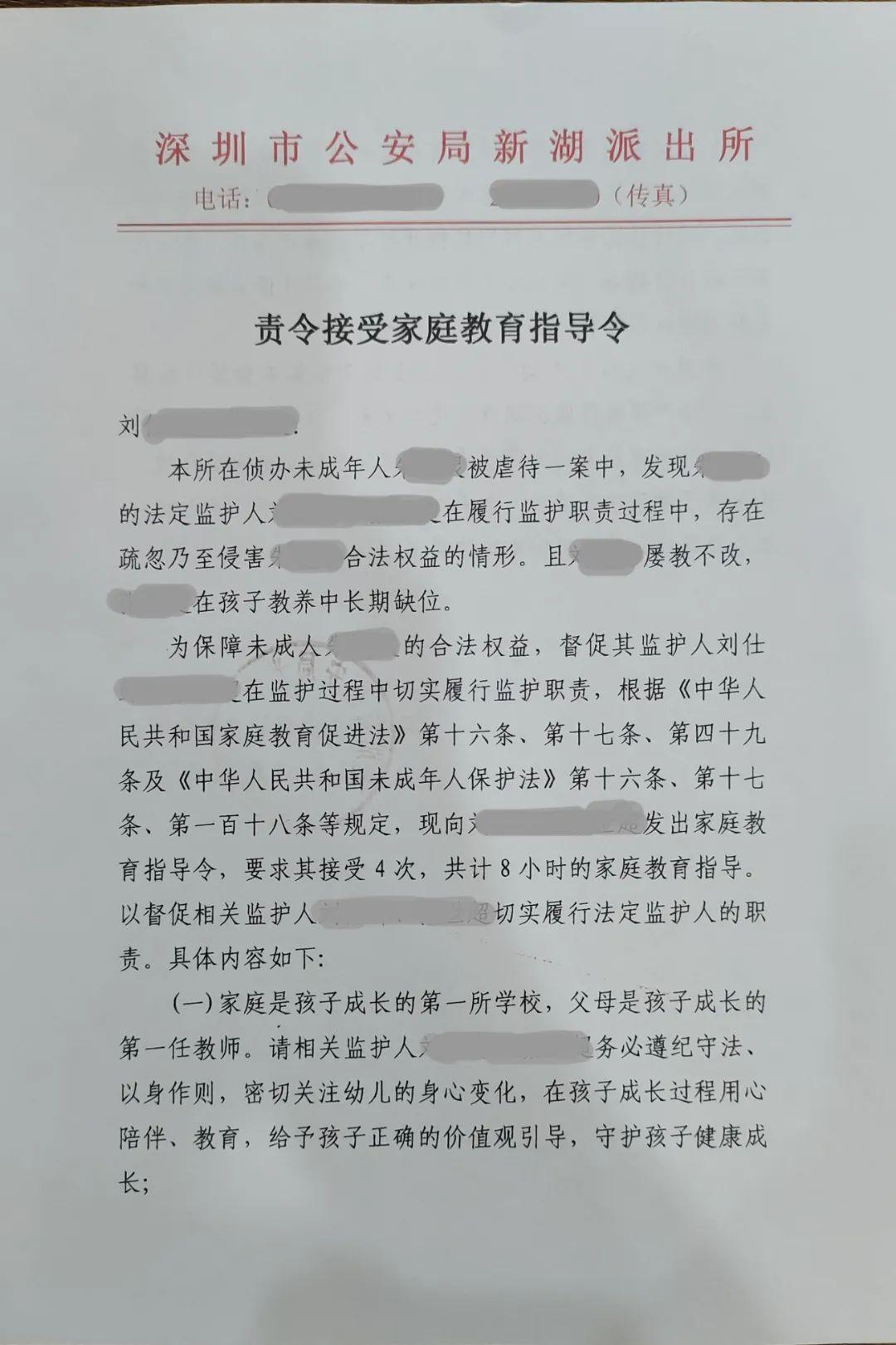 2022年3月31日,深圳市公安局光明分局新湖派出所就依据《中华人民共和国家庭教育促进法》对不好好带娃的刘某夫妻发出《责令接受家庭教育指导令》,责令刘某夫妻接受由区妇联提供的家庭教育指导课程。