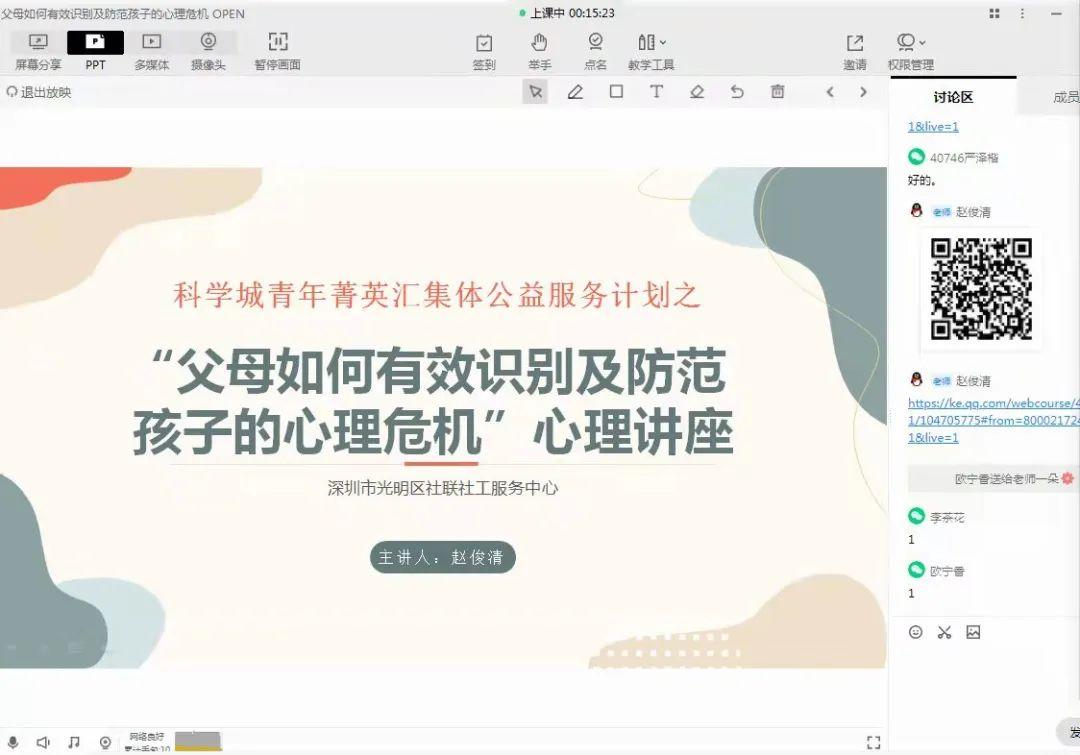 讲座采取线上形式,通过“视频学习+心理技巧分享+家长互动交流”的方式开展,引导家长理解孩子青春期的自我意识、分析青春期危机多的原因,以及如何应对孩子的青春期危机。讲师结合具体案例为家长分享了心理小知识,鼓励家长先自我成长,然后成为孩子遇到心理危机时的有效资源。