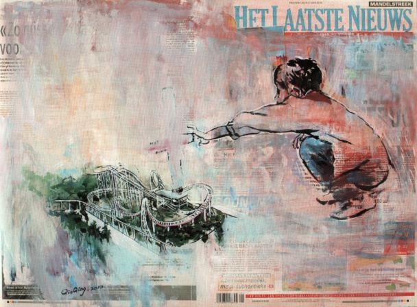 My friend Dong Xiaozhuang from Chengdu came up with the idea to start the same initiative in China. It is dialogue between East and West. Turn over our present day newspapers, the lack of good news is very striking. For us, this was a good reason to decide to only use positive news as the starting point of our project. The language barrier might have distorted my view, but I have the impression that there are clear differences in the way eastern and western artists deal with the news. The project consists of sixty images symbolizing a positive message of June, 2010. The exhibition of the project took place in the prestigious Art Hotel in Chengdu.