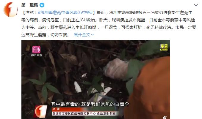 【注意!#深圳毒蘑菇中毒风险为中等#】最近,深圳市两家医院报告三名疑似进食野生蘑菇中毒的病例,病情危重,目前正在ICU救治。2月24日,深圳疾控发布提醒,目前全市毒蘑菇中毒风险为中等。当前,野生蘑菇进入生长旺盛期,一旦误食,可损害肝脏,尚无特效疗法。市民一定要远离野生蘑菇,切勿采摘。