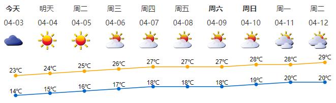 ●4月3日,阴天间多云转晴天干燥,气温14~23℃;4月4日—5日(清明假期)晴天干燥,气温回升,日温差大,早晚清凉;展望4月6日—10日晴天到多云,气温继续回升。
