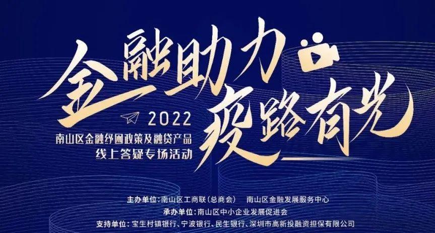 4月1日,由南山区工商联(总商会)、区金融发展服务中心主办的“金融助力 ‘疫’路有光”2022南山区金融纾困政策解读及融贷产品线上答疑专场直播成功举行。活动汇集宝生、宁波、民生、高新投等多家金融机构政策资源,介绍最新线上信用贷款,细解答企业关切的贷款(担保)贴息,延期还贷、再担保贷款等金融焦点难题,及解读《南山区2022年助企(个体工商户)纾困专项扶持措施》金融类扶持政策,以金融助力,精准助企纾困。