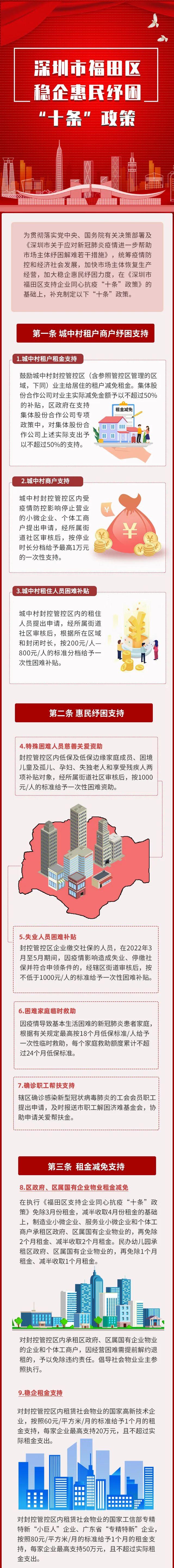 3月20日,福田区针对受疫情影响较大的中小企业,迅速出台了《福田区支持企业同心抗疫“十条”政策》,并于当日率先落地见效,得到社会广泛点赞。近日,福田区持续密切关注经济运行情况,科学研判疫情给企业带来的影响,聚焦实际发展需要,出台了防疫惠企政策《深圳市福田区稳企惠民纾困“十条”政策》(以下简称新十条),有针对性地从城中村租户商户纾困、惠民纾困、租金减免、就业岗位、小微企业工会经费返还、消费惠民、生产经营、防疫消杀服务、金融信贷、心理关爱等10个方面对企业、个人给予支持。