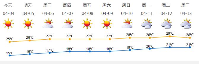 ●4月4日晴天干燥;气温15~25℃,早晚清凉;4月5日晴天干燥,气温回升,日温差大;4月6一10日持续晴天到多云天气,清明假期天晴干燥。
