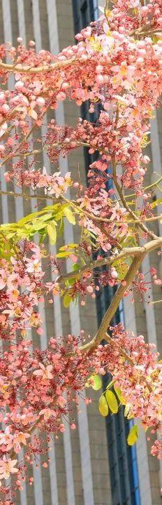 园博园南门广场、深圳湾公园的花旗木,有着“泰国樱花”之称,满树花开时宛若粉色云霞,令人惊艳,目前已初步绽放,预计这几天将迎来盛花期。