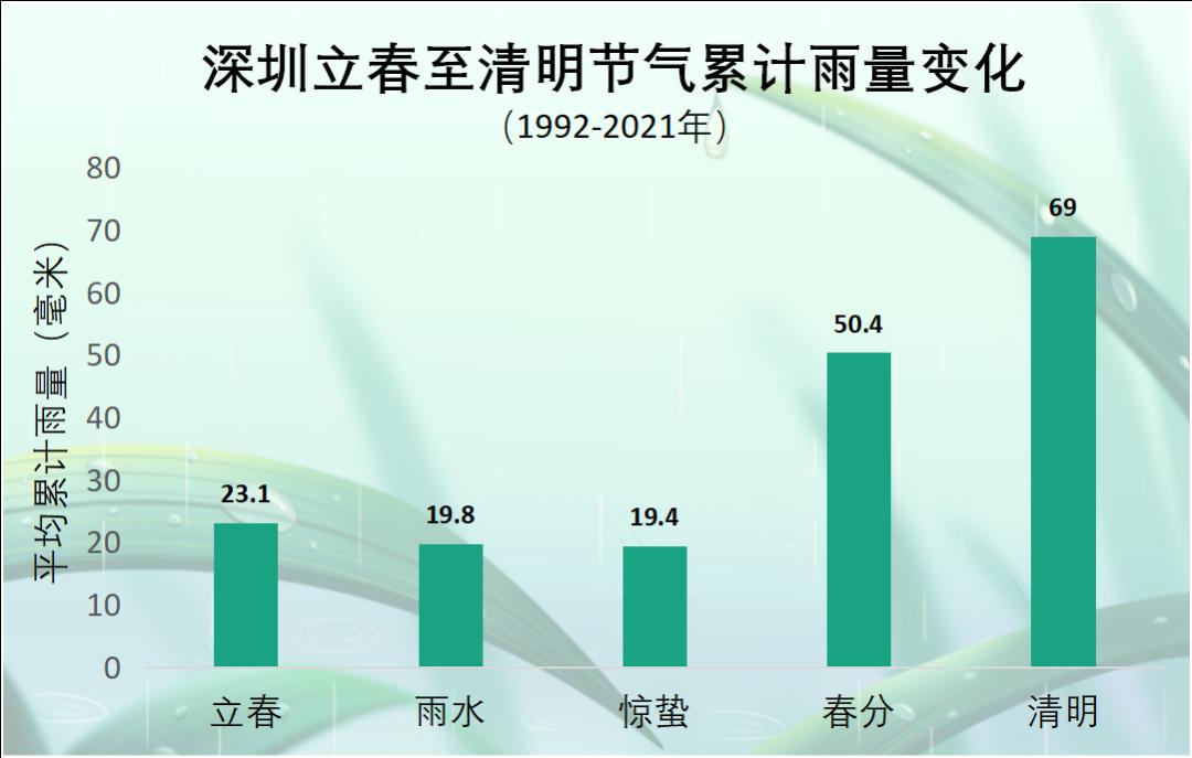 近30年清明期间,深圳平均相对湿度78%,平均累计雨量69毫米,相较春分时增加18.6毫米,需要注意的是,深圳此时的雨可不止是纷纷细雨,有时也会出现“雨哗哗”的情况,近10年清明期间,出现局地强对流天气的平均日数为1.3天,局地暴雨以上平均1.7天,大家一定要及时关注天气预报预警信息,提前做好防范措施。