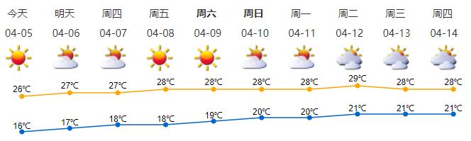 ●4月5日,晴天间多云,空气干燥,气温16~26℃;。4月6日—10日晴天到多云,持续干燥,气温继续回升。