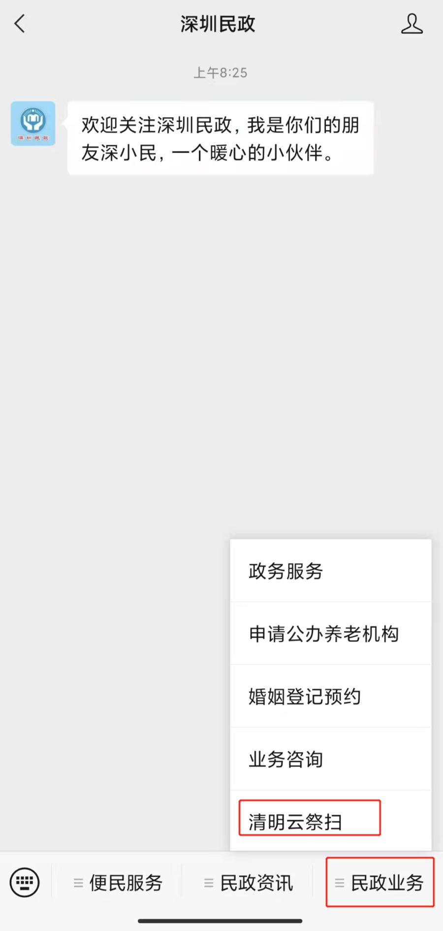 市民朋友可以关注“深圳民政”官方微信公众号后,点击菜单栏“民政业务”,点击“清明云祭扫”即可进入H5页面。