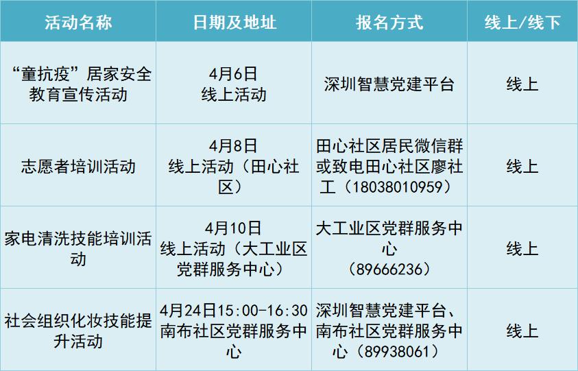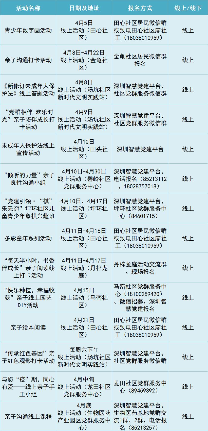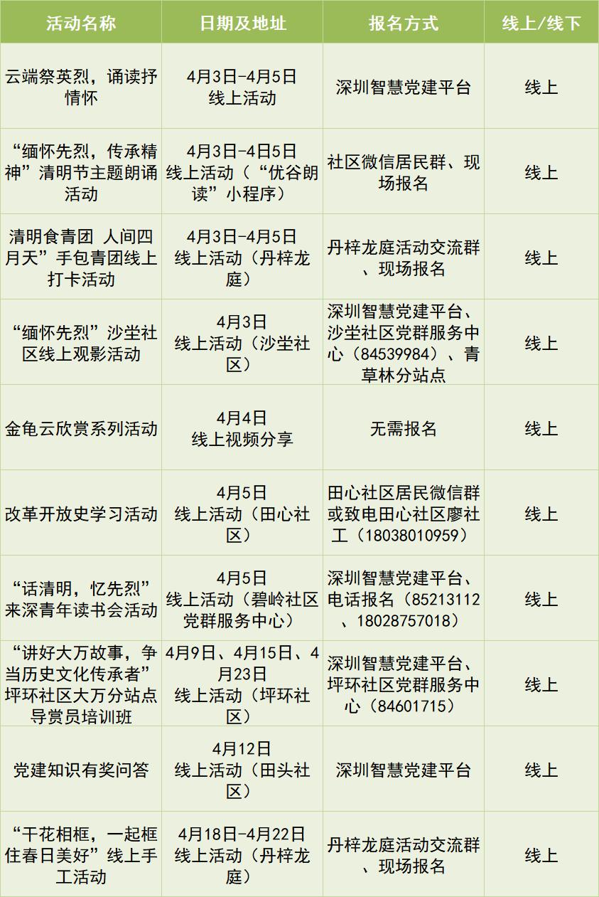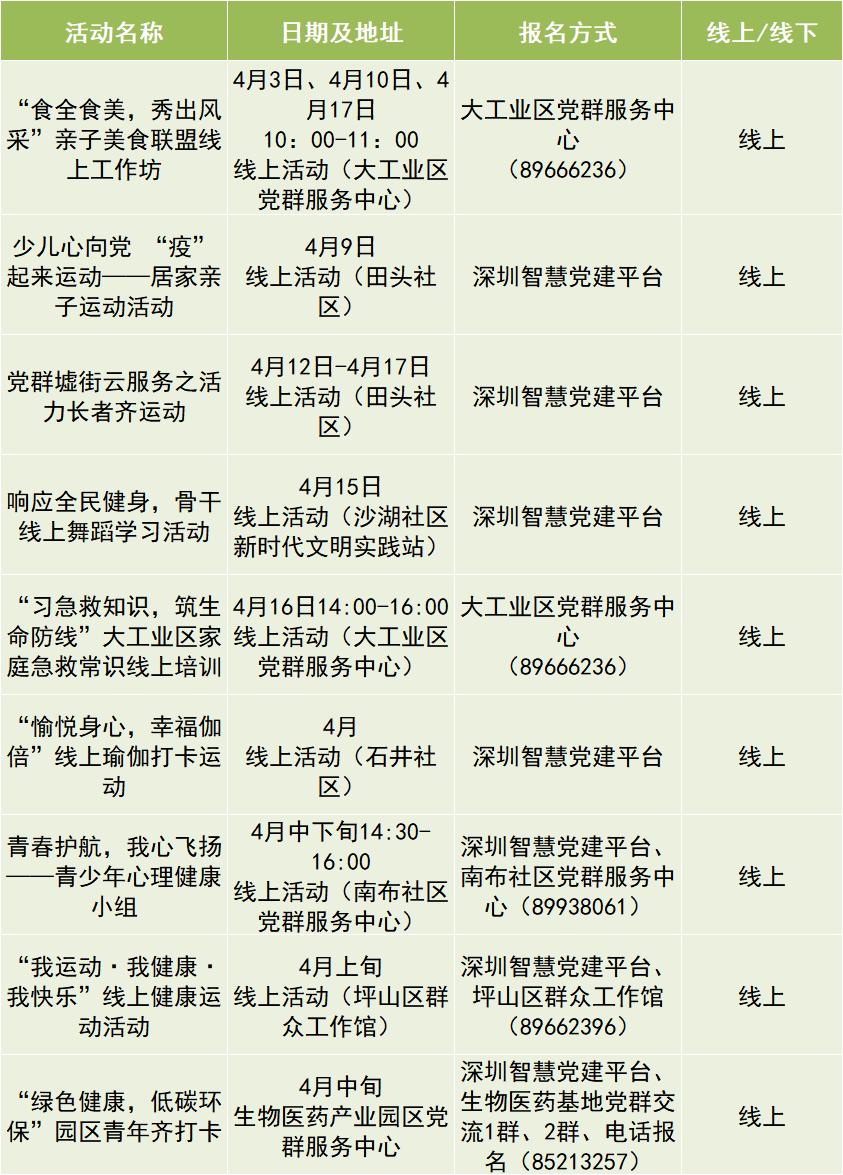 疫情防控不放松文明实践不打烊为了更广泛汇聚文明力量更精准助力当前疫情防控工作4月份坪山区精心策划推出5大类41个线上活动足不出户便可乐享文明文明坪山同心防疫需要各位坪山er的一份力量还在等什么快来“云端”助力吧!文明必修课文化畅享活动关爱未成年活动健康体育活动志愿服务活动精彩活动缤纷呈现各位坪山er感兴趣的话记得提前预约哦~让文明实践丰富整个四月!内容来源 坪山区精神文明建设委员会办公室编辑 黄靖、林一瑛责任编辑 李倩如需转载,请注明以上内容