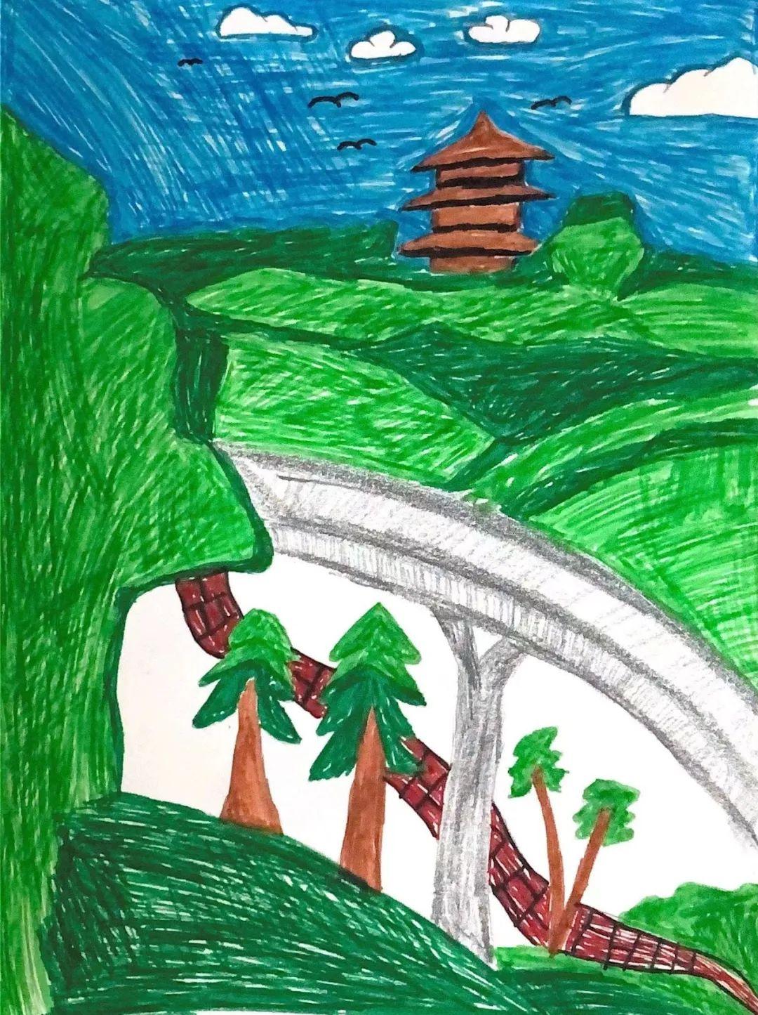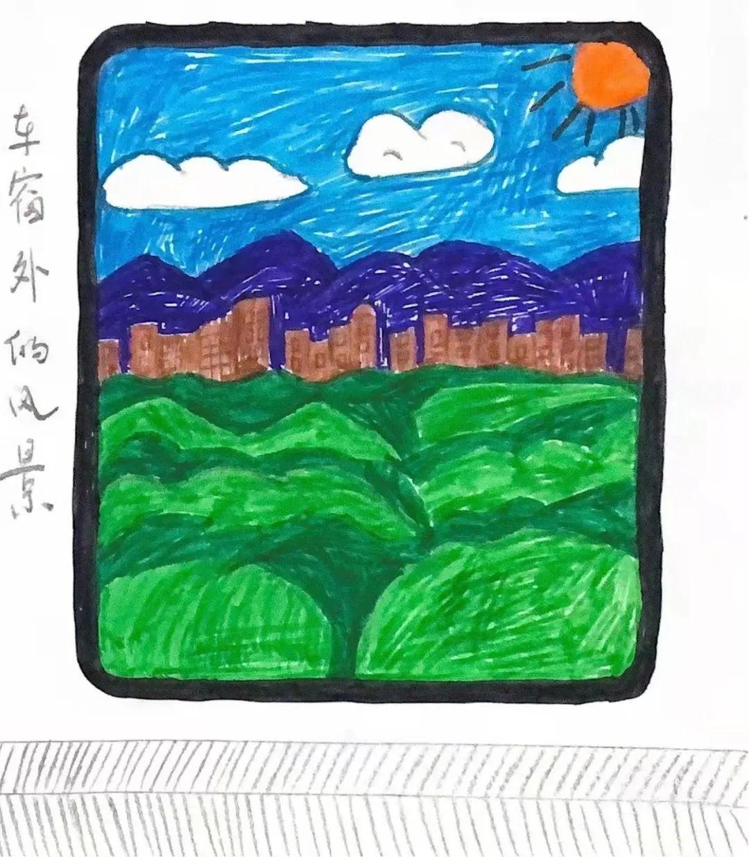 忘记是什么时候在列车上拍的照片了,只记得当初的天很蓝,树木很绿,山很远,这一幕真的太夏天了!就照着画下来了,结果成了手抄报哈哈哈