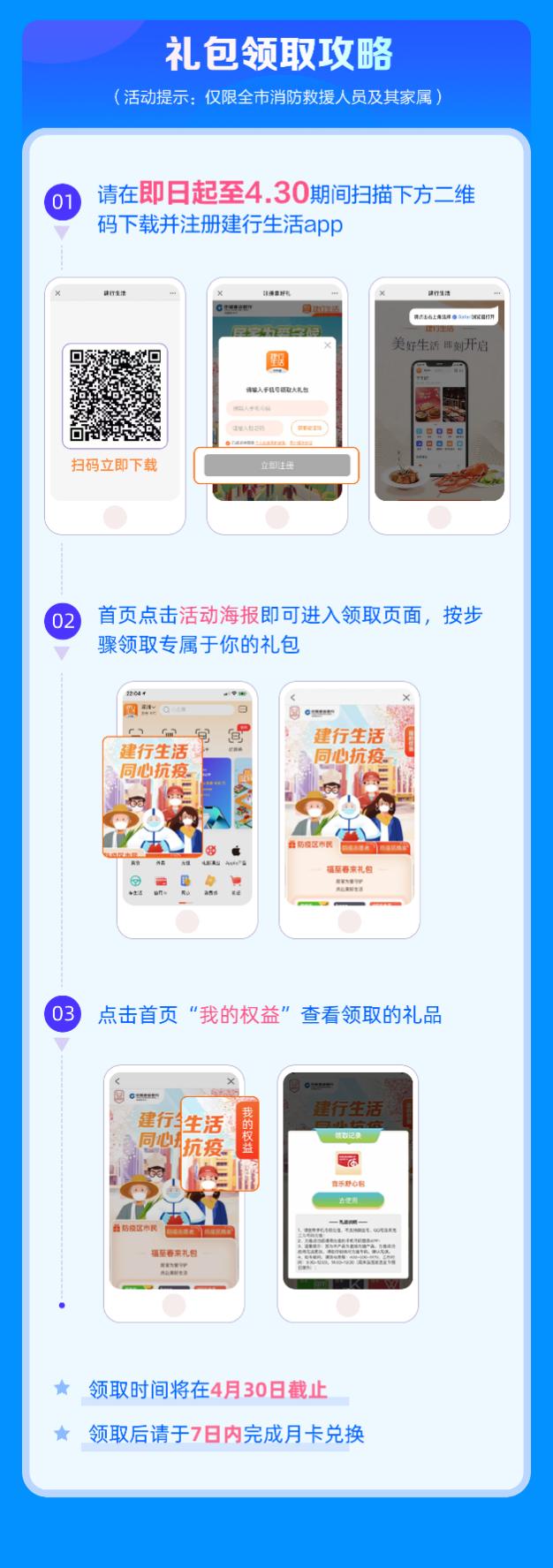 二、扫码领取:礼包于4月11日至4月30日期间陆续发放,在此期间,请报名成功的志愿者直接登陆“建行生活”APP领取即可(识别下方二维码完成APP下载注册,注册手机号需与报名申请的手机号一致)