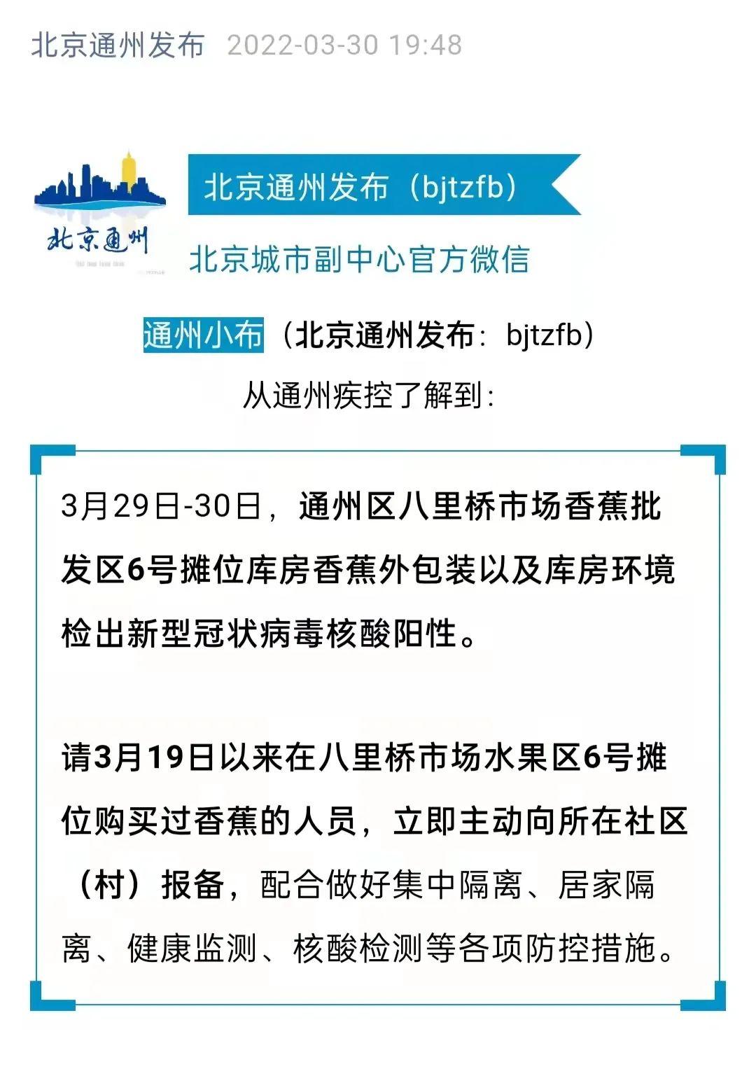 据北京通州发布消息,3月29日-30日,通州区八里桥市场香蕉批发区6号摊位库房香蕉外包装以及库房环境检出新型冠状病毒核酸阳性。