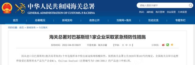 4月3日,海关总署官网发布消息称,因从进口自巴基斯坦1批次冻带鱼的1个外包装样本中检出新冠病毒核酸阳性,按照海关总署公告2020年第103号的规定,全国海关自即日起暂停接受巴基斯坦水产品生产企业M/s. Chiltan Seafood(注册编号为T-290/2001)的产品进口申报1周。