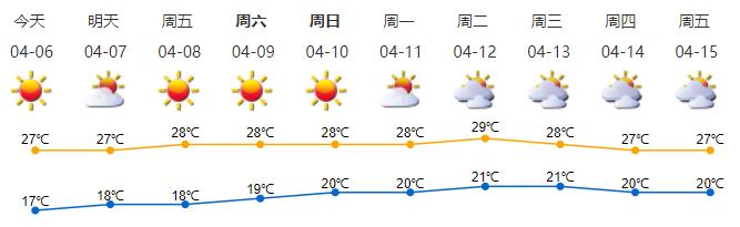 ●4月6日,晴天干燥,气温17~27℃;未来一周天气平稳,晴朗干燥天气持续。
