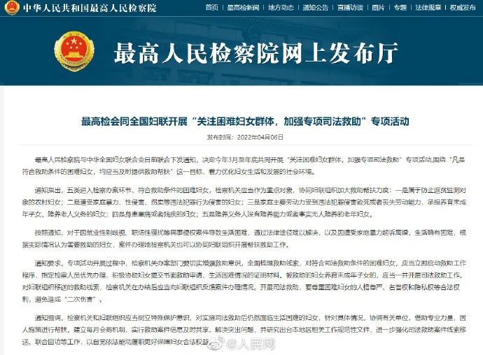 ●最高人民检察院与中华全国妇女联合会日前联合下发通知,决定今年3月至年底共同开展“关注困难妇女群体,加强专项司法救助”专项活动。加强对被拐卖妇女等困难妇女群体救助帮扶。