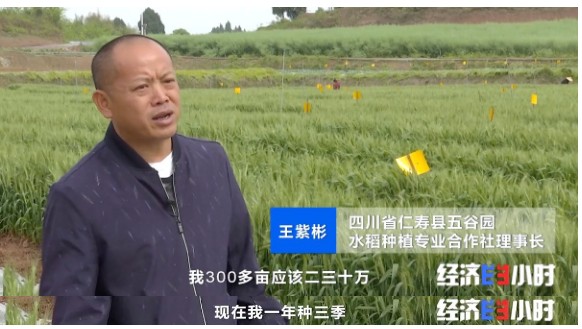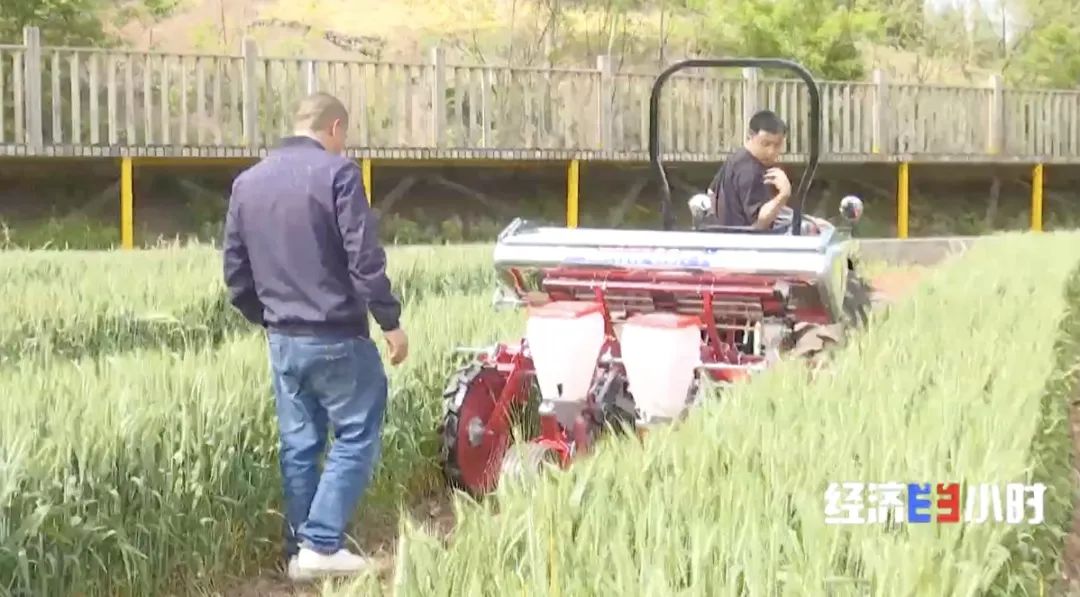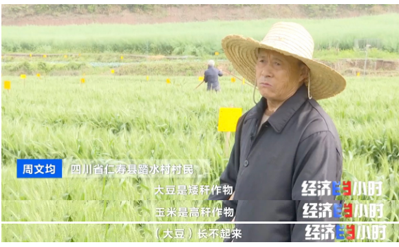 四川省仁寿县踏水村村民周文均今年种的玉米和往年不太一样。以往种玉米,种子都会均匀播在田里,但是今年他们是在郁郁葱葱,已经半米多高的小麦当中播种玉米。从空中看去,一排小麦,一排玉米,非常有规律。