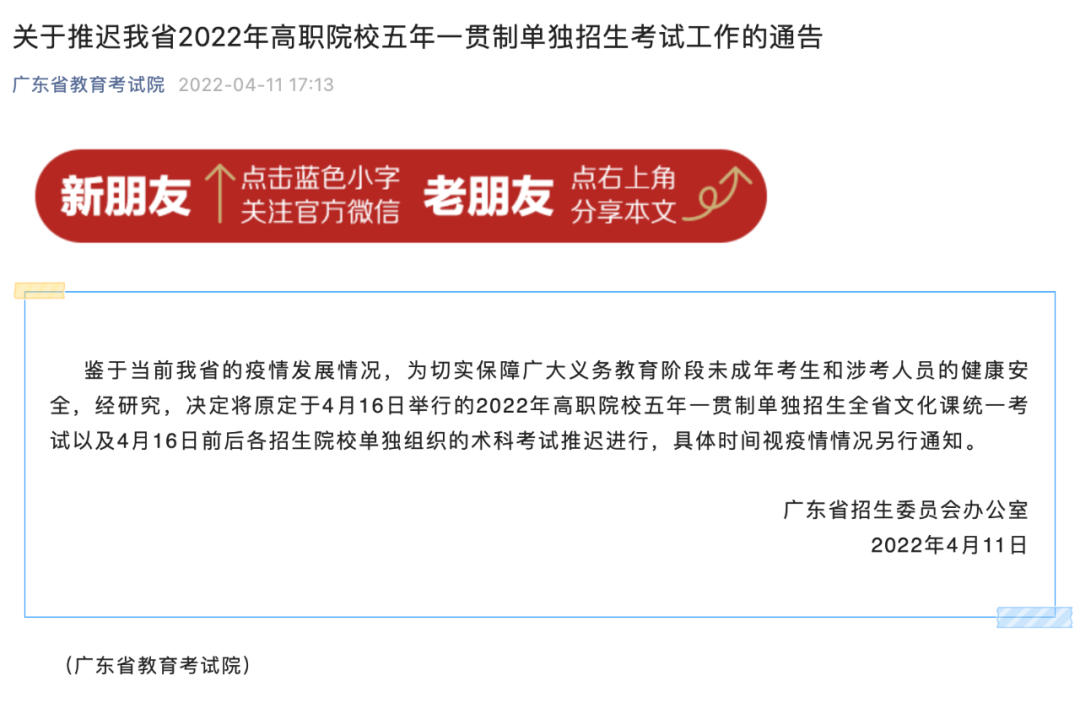 4月11日下午,广东省教育考试院发布通知称,鉴于当前广东省的疫情发展情况,为切实保障广大义务教育阶段未成年考生和涉考人员的健康安全,经研究,决定将原定于4月16日举行的2022年高职院校五年一贯制单独招生全省文化课统一考试以及4月16日前后各招生院校单独组织的术科考试推迟进行,具体时间视疫情情况另行通知。