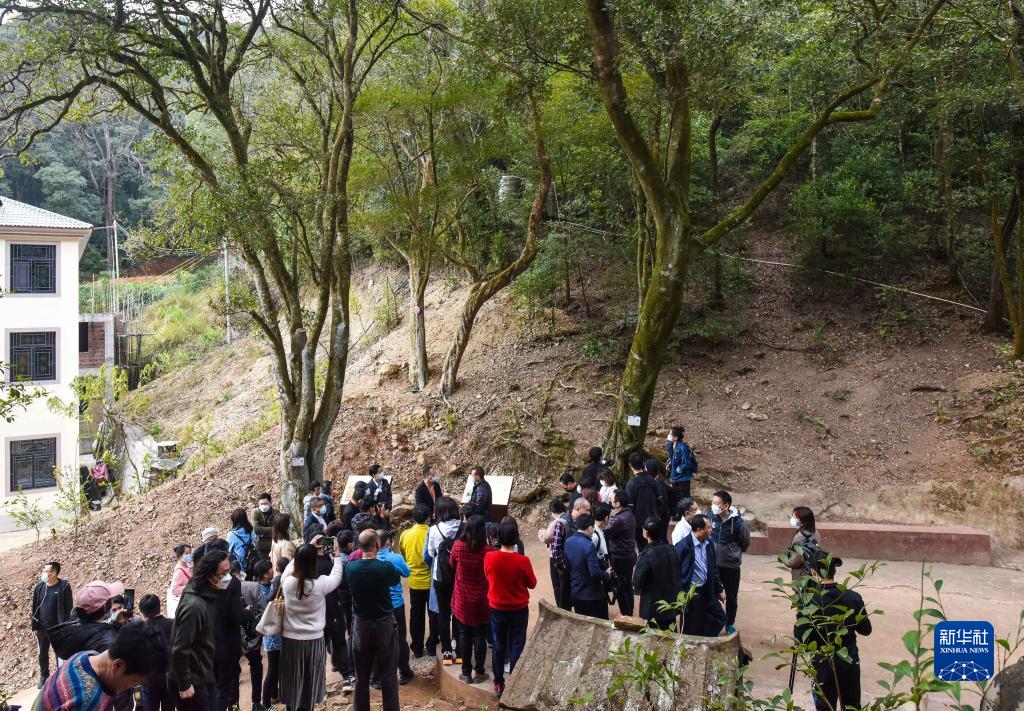 在广东梅州大埔县茶阳镇闽粤交界处的伯公凹,参观者在百岁古树下听讲解员介绍中央红色交通线历史(1月9日摄)。