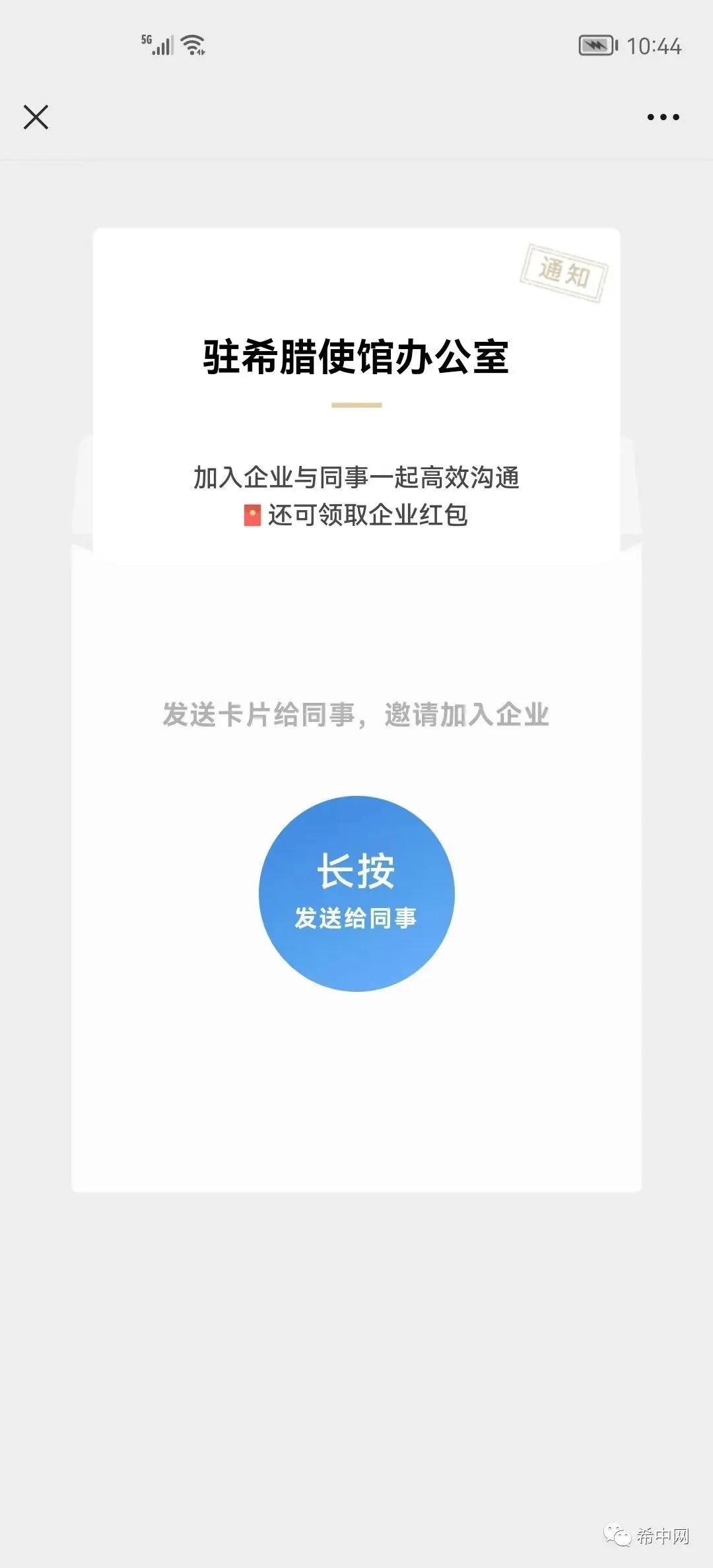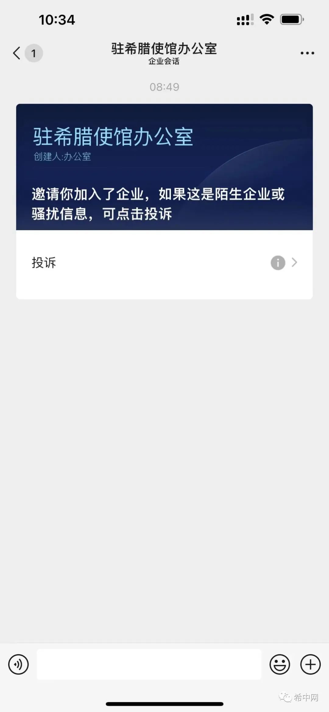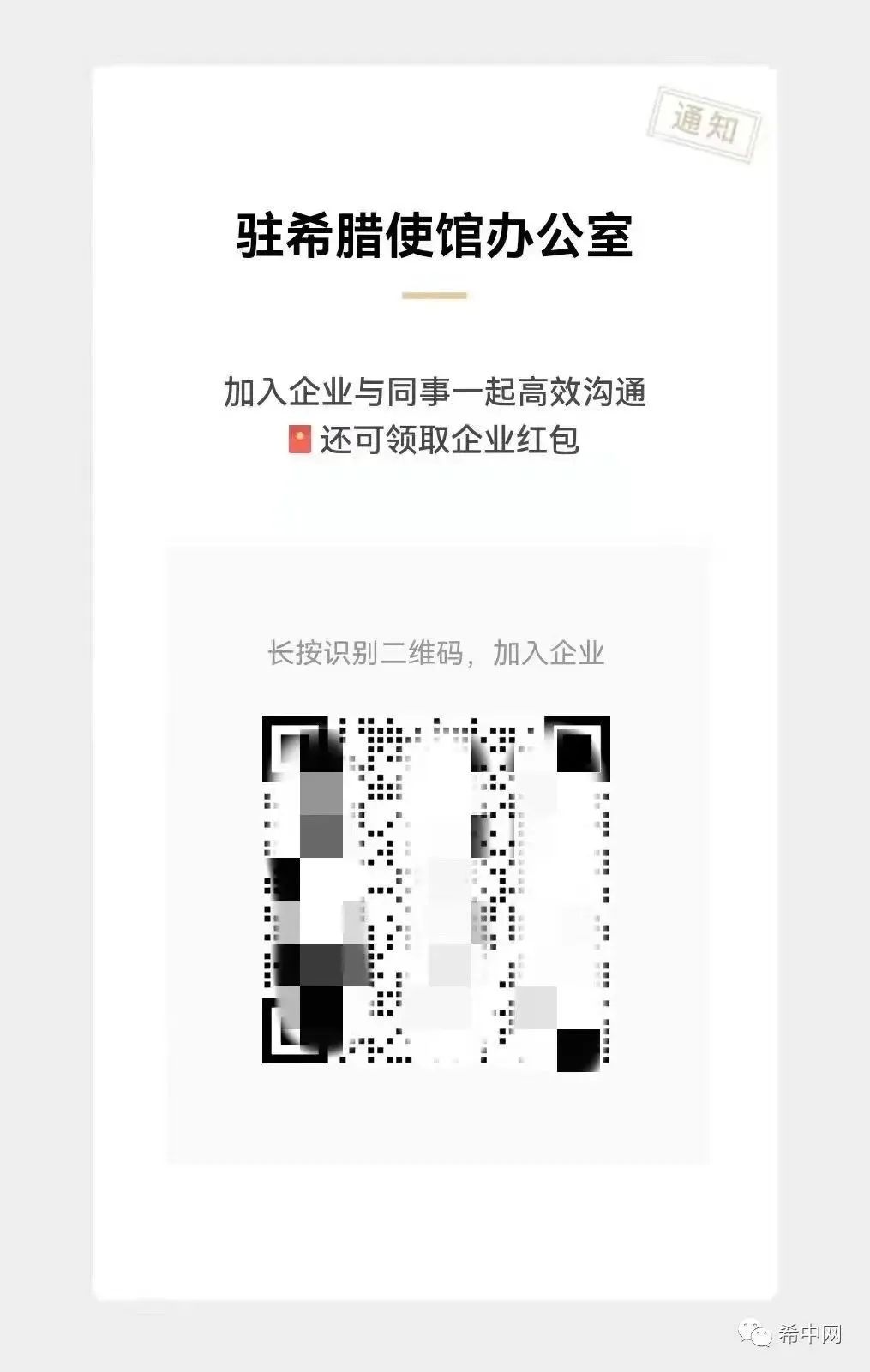 领事直通车2022年4月19日讯 近日,部分侨胞向中国驻希腊大使馆反映收到“驻希腊使馆办公室”的企业微信邀请,经核实此企业微信系假冒使馆名义,请大家务必保持警惕,不要添加该账号,若已添加为好友应立即删除,谨防上当受骗。