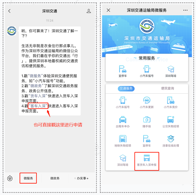 相关车辆司乘人员应在客运车辆抵达深圳市前24小时内,关注“深圳交通”公众号,点击“微服务”,选择“客货车入深申报”,按照页面指引填报有关信息,生成专属二维码。