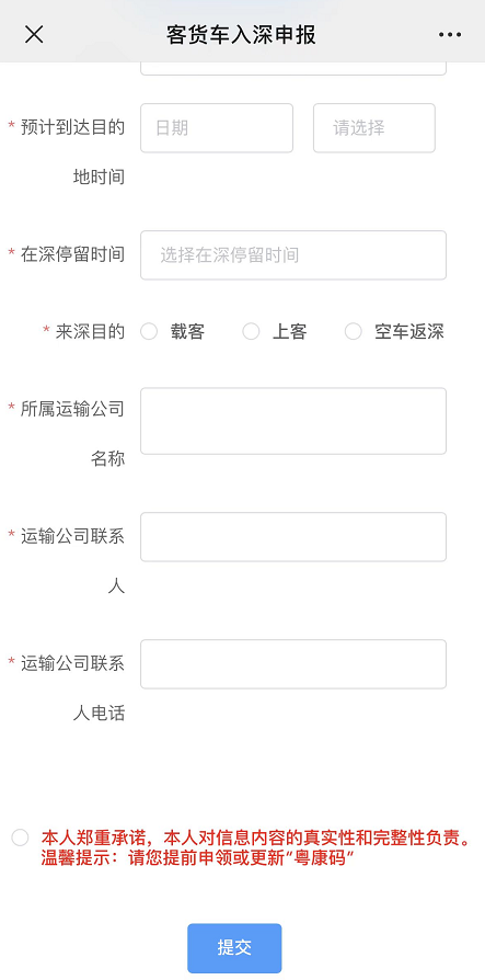 请相关车辆司乘人员进行入深申报,认真核对填报信息,确保真实准确,并提前申领或更新“粤康码”,以便于顺利通行。客运企业应提前提醒乘客进行个人行程和健康申报。未按要求进行入深申报导致发生疫情传播事件的,将依法追究责任。