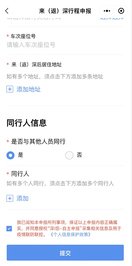 根据《深圳市新型冠状病毒肺炎疫情防控指挥部办公室通告(第4号)》要求,乘客应在客运车辆抵达深圳市前24小时内,通过“深i您”小程序,点击“来(返)深行程申报”,按照页面指引填报有关信息,进行行程和健康申报。
