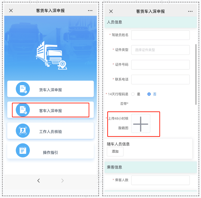 第二步:点击“客车入深申报”并填写车辆信息、司机及随行人员信息、来深路径等相关信息,并上传48小时核酸截图。