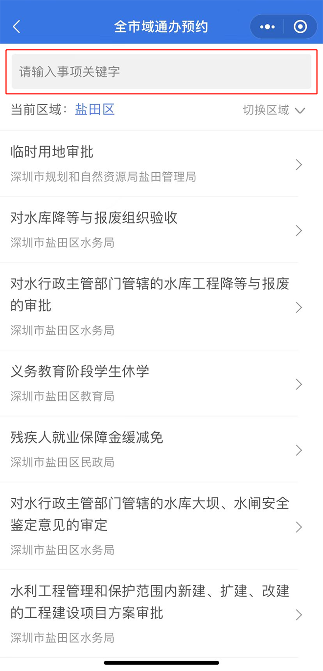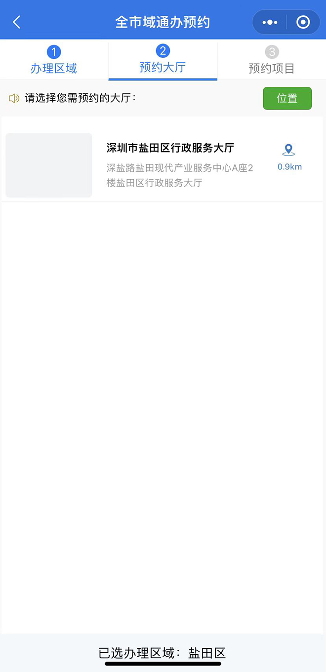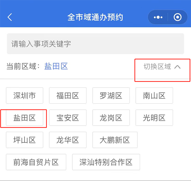4、点击事项名称后,进入预约页面,按需选择预约事项的办理区域、预约大厅及预约项目(全市域通办业务)。