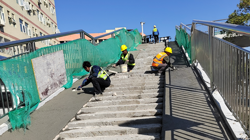 针对后亭人行天桥安全隐患问题,宝安管理局决定在不改变天桥原有主体结构的情况下,对天桥交通组织进行优化,明确“人非”行进路权空间,并采用施工新材料进行维修整治。
