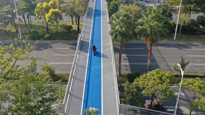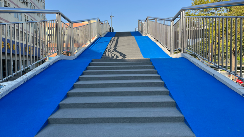 据了解,实施改造的具体措施包括由单条推行坡道,改为左右两侧双向推行坡道,避免上下行交织冲突;采用“彩色陶瓷颗粒+彩色环氧沥青”新材料对天桥铺装进行维修整治,将桥面铺装得更防滑耐磨、牢固美观;利用蓝、灰色彩勾勒不同交通流线:蓝色为推行坡道及推行直道,灰色为人行台阶踏步及人行道。