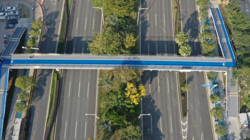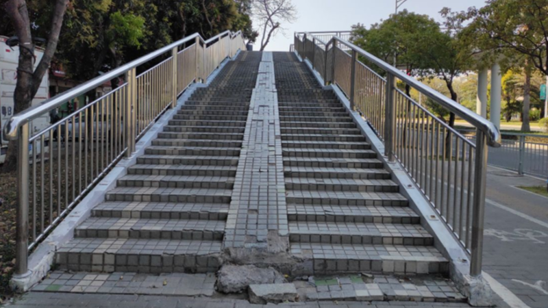 过街天桥是解决人车通行问题的重要交通路径补充。该桥是横跨宝安大道的重要立体过街设施,是市民出行的重要通道。经长期使用,桥面铺装出现面层脱落、缺损,表面光滑等病害,现有梯道及推行坡道,已无法满足推行需求,易导致桥上交通上下行交织冲突……由于该路段建设时间比较早,长期使用后问题层出不穷,这不仅影响市民出行,而且还存在一定安全隐患。
