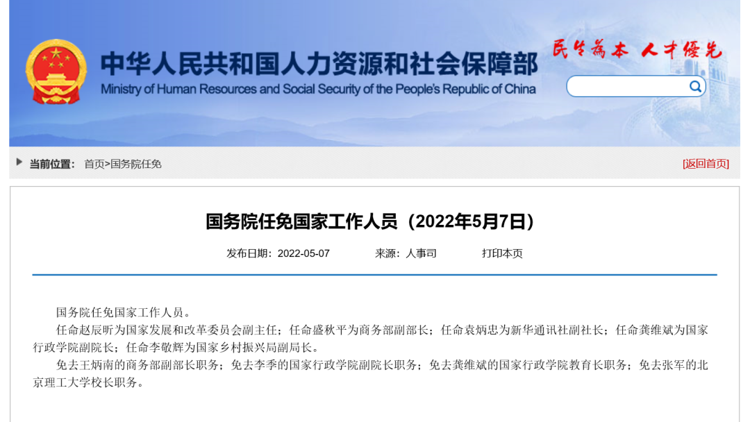 任命赵辰昕为国家发展和改革委员会副主任;任命盛秋平为商务部副部长;任命袁炳忠为新华通讯社副社长;任命龚维斌为国家行政学院副院长;任命李敬辉为国家乡村振兴局副局长。