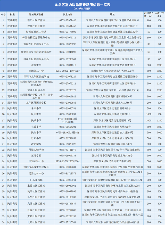 读特客户端·深圳新闻网2022年5月10日讯(记者 胡安坤)2022年汛期已至,据深圳天气预报,预计11日到15日深圳市将有持续性暴雨、局部大暴雨。为做好汛期公众避险和救助服务,龙华区发布106处室内应急避难场所具体信息。如遇灾情险情,居民可前往避难场所寻求救助。