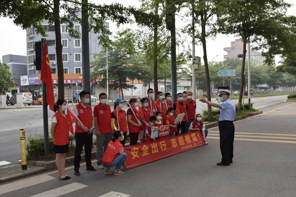 这是辖区企业深中海医疗用品(深圳)有限公司党支部飞速义工队组织开展的“疫情防控、维护道路交通安全”志愿服务活动,参与的小朋友都是义工队队员的孩子,利用周末时间和父母一起来做文明志愿者。交警为小志愿者从灯位显示作用到斑马线礼让行人、提高自身安全意识等各方面详细地讲解文明交通常识,通过简单的培训之后,小志愿者在家长志愿者的带领下,分别到达各自的值岗地点。