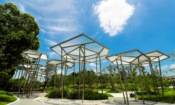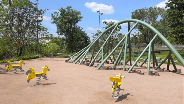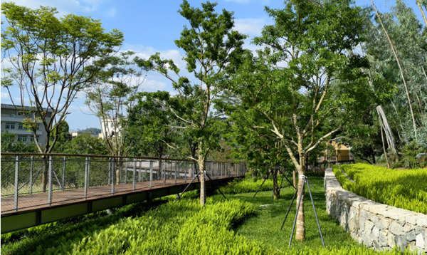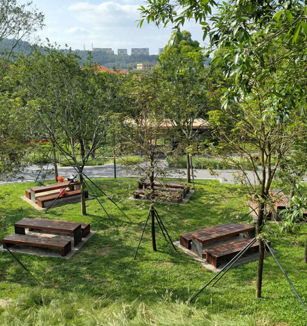 按照原生态、近自然、少迁树的原则,公园完全保留了建设范围内原有的荔枝林,并通过底层植被梳理、辅以平衡木等设施,营造成可供儿童游玩、休憩、攀爬的林下亲子游乐空间。