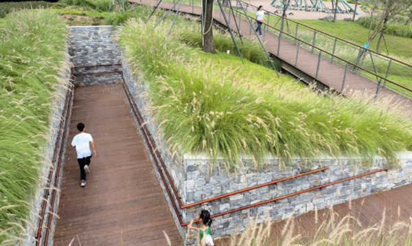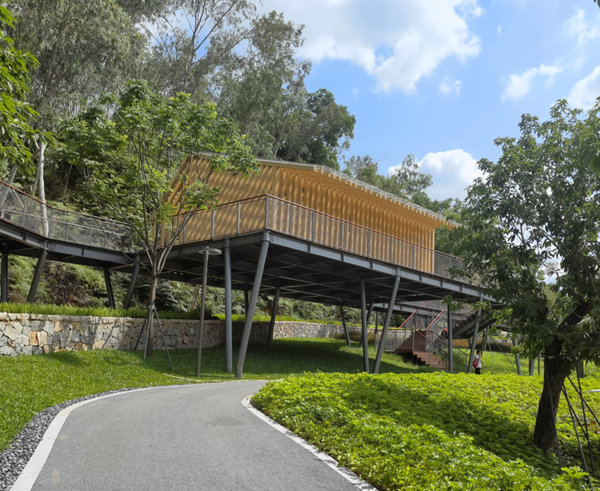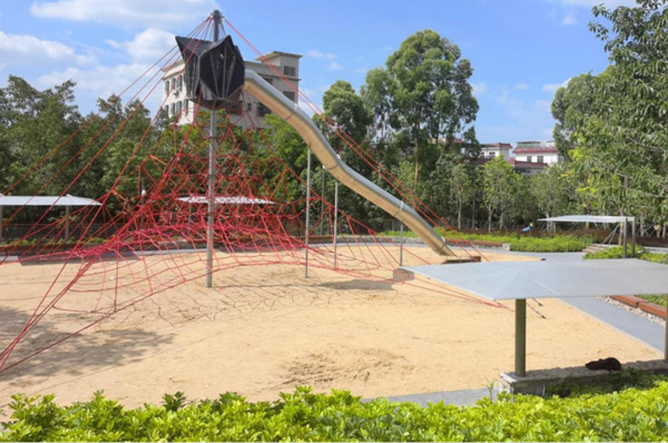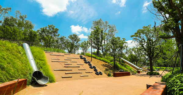 公园坚持尊重自然、保护自然的理念,充分利用了场地原有的地形地貌与山体资源,最大限度地保存了原有自然山貌和植物群落多样性的特征,并巧妙地将自然地形地貌与儿童游乐设施相融合,通过梯级平台与空中连廊弥补高差,同时利用高差设置了爬梯、滑索等游乐设施。