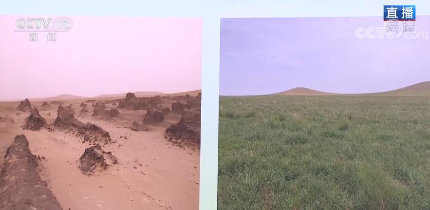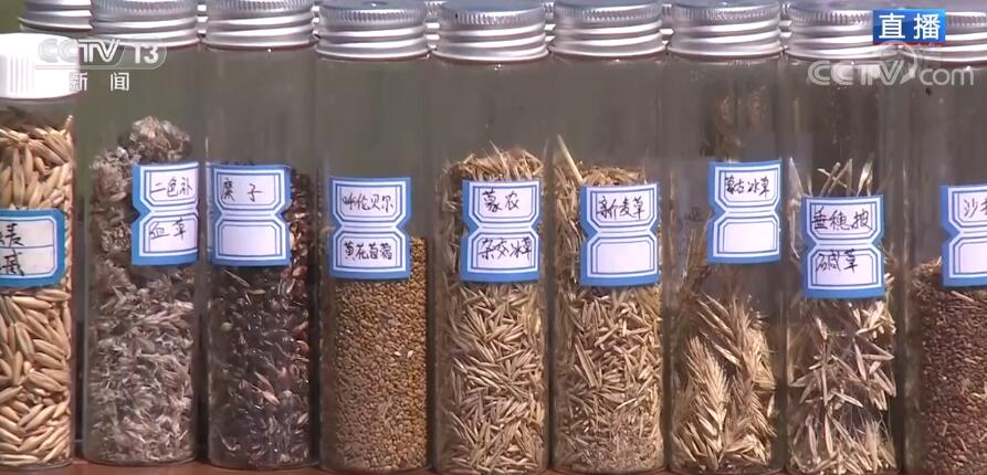 当然,光凭着“带薪休假”这样的“保养”是远远不够的。乌拉盖草原的土壤属于沙化土壤,所以一旦遇见极端天气或者是植被被破坏后,就会产生风蚀坑和沙化草地。2010年前,当地的沙化面积一度超过5000多亩。我身旁的这张图,就是当年沙化草原的真实写照。那么您再看右边这副照片,通过这个小山坡可以看到两张照片是拍摄于同样的地点,但是样貌已经发生了翻天覆地的变化,原本光秃秃的草原是如何摇身一变换上一身鲜艳的绿装呢?那就要看我身旁的这些瓶瓶罐罐了,这里面装着的就是草种,这是林草专家历时多年搜寻、试验寻找到的适合乌拉盖草原气候、水土条件,能够快速生长的草种。像我手上拿的就是沙生冰草,这种草种非常适合生长在沙化土壤,有很强的耐寒性和耐旱性,可以改良草场,而且还非常适合放牧利用。有了这些草种以后,我们就可以进行沙化草地的治理了,您现在看到的就是沙化草地的治理现场,我们在平整完土地后,把这些草种进行科学补播,最后铺设沙障,通过这种科学治理的新方式来防风阻沙,改变风蚀状况,让乌拉盖草原恢复生机。
