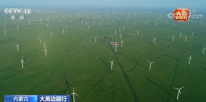这里是位于内蒙古中部边境旗县的36座风电场,巨大风车迎风转动,将草原上的风转化成清洁的电能。